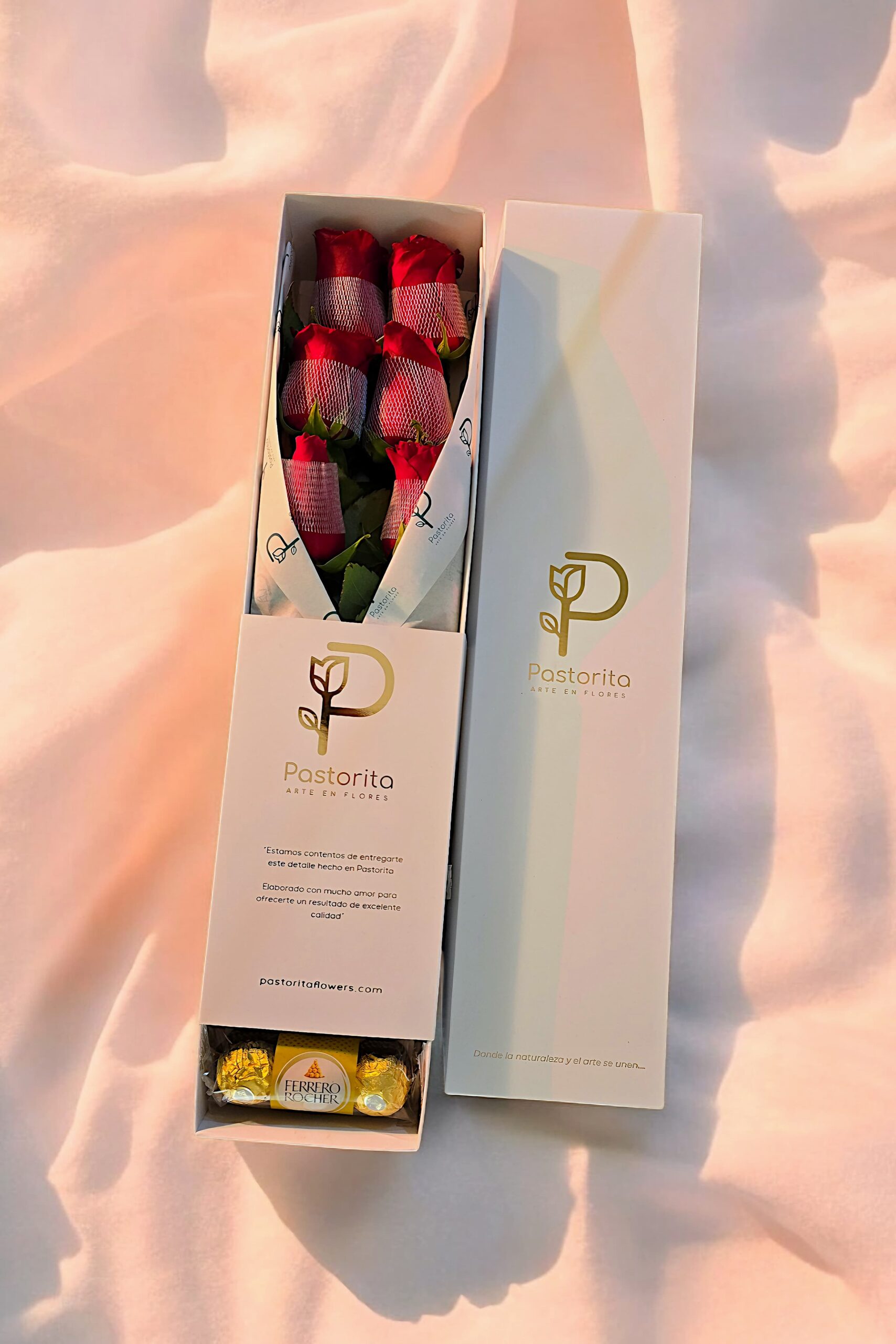 + Tarjeta de cuidados gratis6 rosas selectas y chocolates ferrero