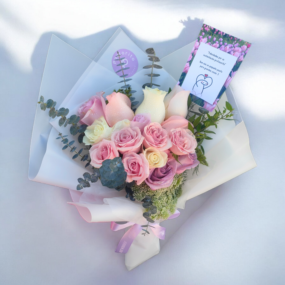 + Tarjeta de cuidados gratisComposicion Floral Natural Contiene 14 rosas de videro en colores variados y follaje a disponibilidad segun temporada. Un regalo perfecto para expresar tus sentimientos de manera original y elegante.