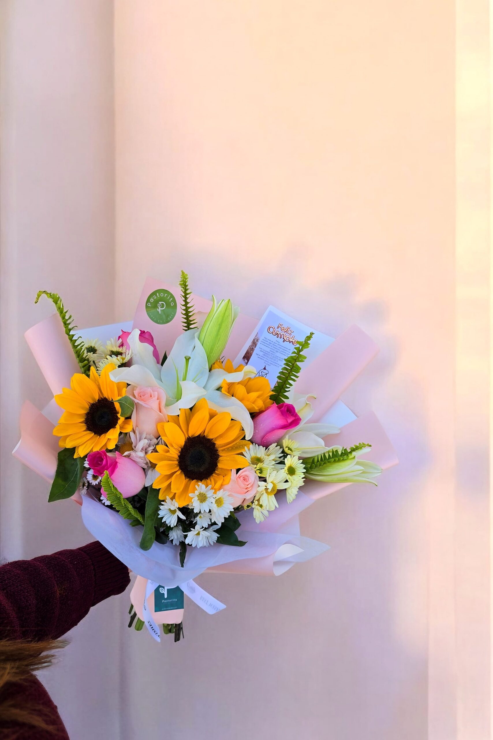 - 3 girasoles, lilium perfumado, 6 rosas, margaritas y follaje de temporada.